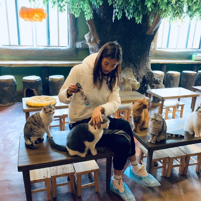 12月13日,上海女足门将赵丽娜外出玩乐,来到一家有猫的店子里做了个幸福的吸猫人。