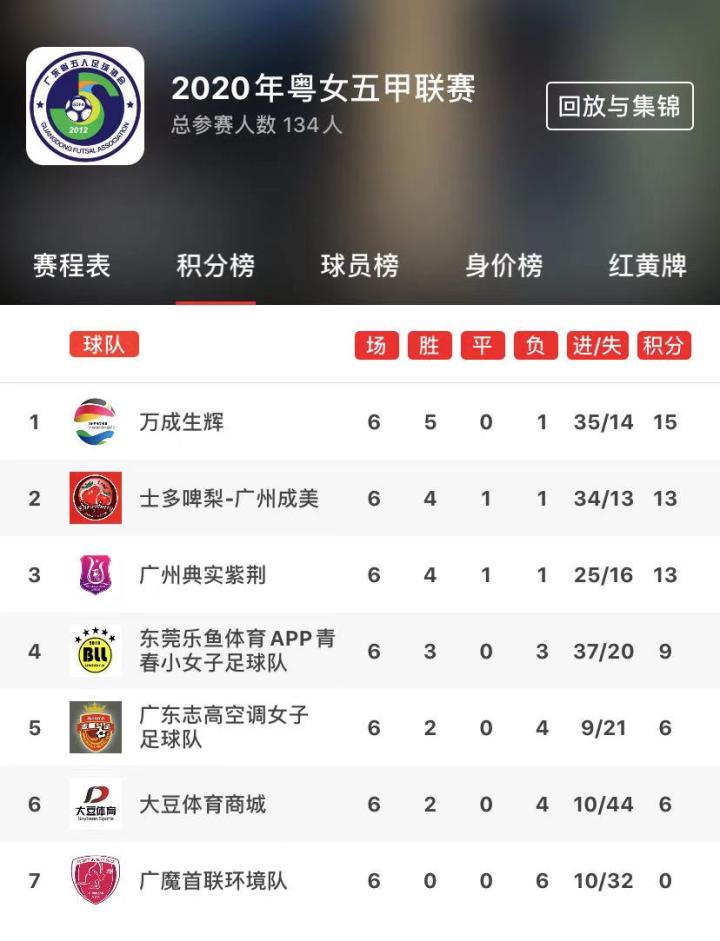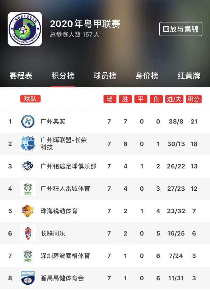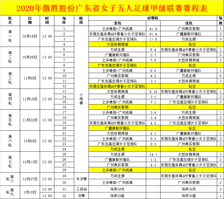 第九届广东省五人足球甲级联赛8支球队第7轮比赛比分如下: