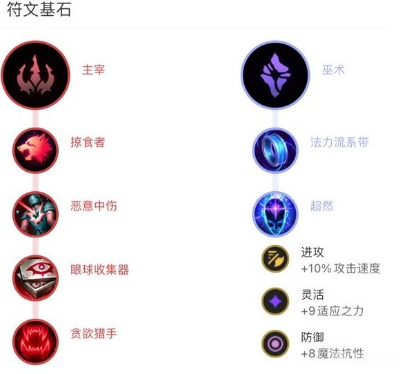 符文推荐点主系主宰,副系巫术,属性碎片1攻速+1自适应+1魔抗。