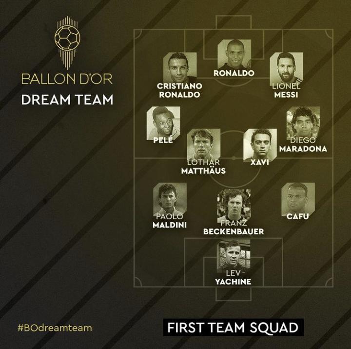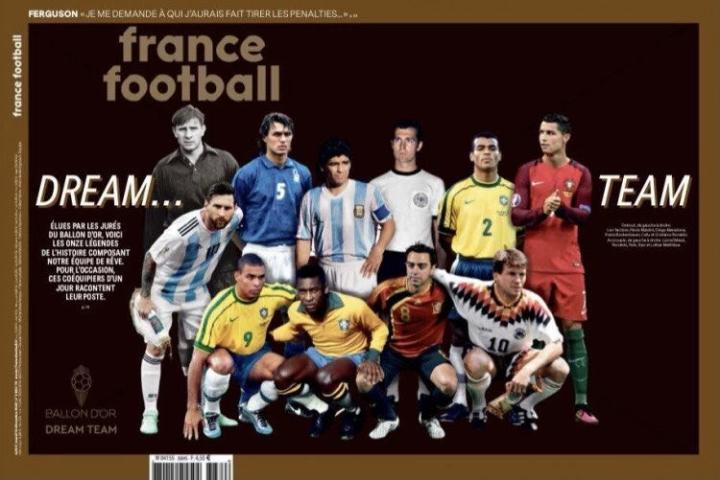 《法国足球》评选足坛历史最佳11人(阵型:3-4-3),现已揭晓11人完整名单。 前锋:C罗、罗纳尔多、梅西 中场:贝利、哈维、马特乌斯、马拉多纳 后卫:卡福、贝肯鲍尔、马尔蒂尼 门将:雅辛 据悉,这阵容是由全球170位足球专家(包括140名记者)参与投票,正所谓一千个人心中就有一千个哈姆莱特。这种评选同样的,不管选谁不选谁,总有人满意也总有人不满意。 若是我选,我会用齐达内换哈维,其他的没意见。你呢?