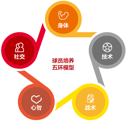 一刻足球近日,《中国足球协会青少年训练大纲》正式发布,在《青训大纲》中清晰提出了球员培养的“五环模型”,即:技术、战术、身体、心智和社交。“五环模型”简要说明了年轻球员在其自身成长与发展过程中应考虑的要素,也表明在训练中教练需要侧重的五个方面。