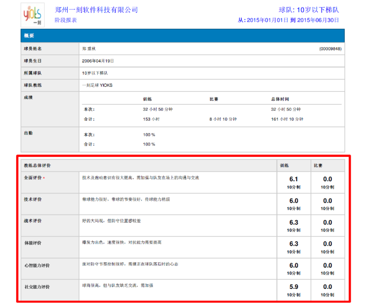 可将球员的训练和比赛数据整合在一起,生成一份专业汇报和总结。该报表不但可以提供成绩曲线,还可全面显示教练对于球员在技术、战术、体能、心智能力、社交能力五个方面的评价及得分,全面展示该球员的综合素质。根据得分与评价,教练可有针对性的进行训练,使球员得到全面均衡的发展。