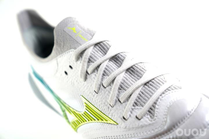 浅灰色的一体化针织鞋舌是β版本中最扎眼的存在,曾几何时你都不敢想象在美津浓这样的一个品牌中会出现赶时髦的针织材质。有明显竖纹的BF Knit整体精致感还算不错,但是细腻度和那种极致包裹感还是和耐克的Flyknit有一些差异。