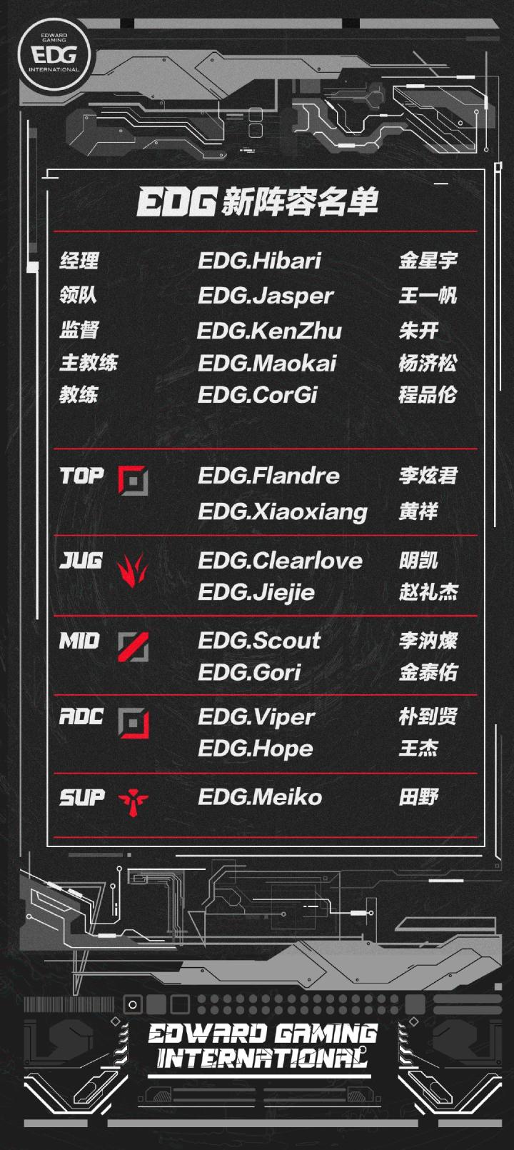 在选手阵容上,EDG对选手阵容进行了大刀阔斧地调整,在不同位置上都引入和保留了强力选手。希望新加入的选手们可以尽快融入EDG大家庭,大家一起努力提升竞技状态,在未来的赛季中打出自己最佳的状态!