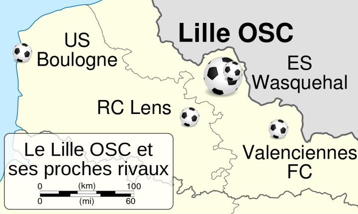 从下面的地图可以看出,该大区内除了里尔与朗斯外,还有一支法甲常客瓦朗谢纳,但该队总体不如里尔与朗斯,因此该队和里尔的德比往往被称为小北方德比。