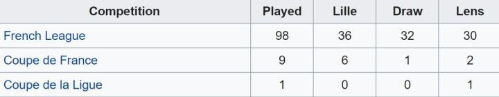 毫无疑问,正如多特与沙尔克那样,里尔在整体战绩上同样占优,以42胜32平33负小幅领先于朗斯。