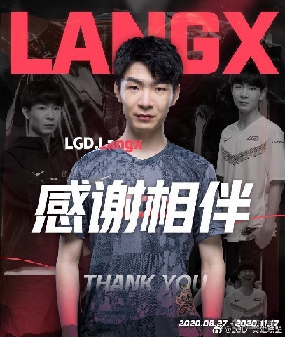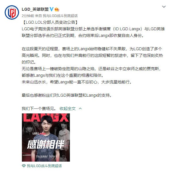 LGD官宣:Langx选手合约到期,恢复自由人身份 峡谷全视野 峡谷全视野2020-12-17 11:21LGD战队官宣人员变动:队内上单选手上单选手谢镇营(ID:LGD.Langx)与LGD英雄联盟分部选手合约已正式到期,合约结束后Langx即恢复自由人身份。Langx选手曾效力于RNG战队,于2020年5月加入LGD电子竞技俱乐部英雄联盟分部,担任上单出征LPL夏季赛。也帮助战队成功获得S10资格,并成功杀入S10正赛。展开更多