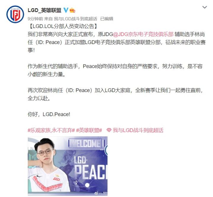 LGD官宣:原JDG辅助选手Peace正式加盟 峡谷全视野 峡谷全视野2020-12-17 15:40LGD官博:我们非常高兴向大家正式宣布,原JDG@JDG京东电子竞技俱乐部 辅助选手林尚任(ID: Peace)正式加盟LGD电子竞技俱乐部英雄联盟分部,征战未来的职业赛事!作为新生代的辅助选手,Peace始终保持对自身的严格要求,努力训练,是不容小觑的新生力量。再次欢迎林尚任(ID: Peace)加入LGD大家庭,全新赛季让我们一起勇往直前,全力以赴。你好,LGD.Peace!展开更多