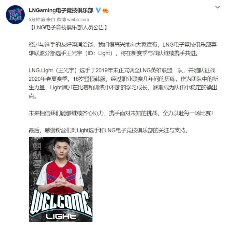 峡谷全视野LNG官博:经过与选手的友好沟通洽谈,我们很高兴地向大家宣布,LNG电子竞技俱乐部英雄联盟分部选手王光宇(ID:Light),将在新赛季与战队继续携手共进。