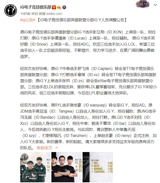 峡谷全视野iG官博:原iG电子竞技俱乐部英雄联盟分部iG.Y选手彭立勋(ID:XUN)上调至一队,担任打野;原iG.Y选手李谭潘奥(ID:Lucas)上调至一队,担任辅助。 原iG.Y选手吴好顺(ID:Snow)上调至一队,担任ADC。欢迎三位选手加入iG.LOL,希望三位选手加入一队之后能汲取经验,不断提升,努力学习进步,在更广阔的舞台勇敢追梦。