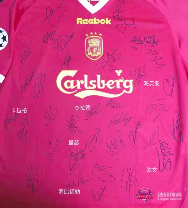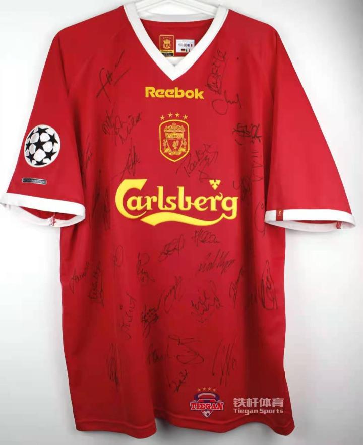 这件利物浦欧战版球衣,包含了欧文、杰拉德、卡拉格、罗比福勒在内的绝大多数当时利物浦球员的签名。