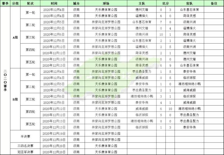 北京时间12月13日,2020年山东省业余足球超级联赛小组赛在济南天乐康体育公园和井家沟足球梦想公园结束争夺。