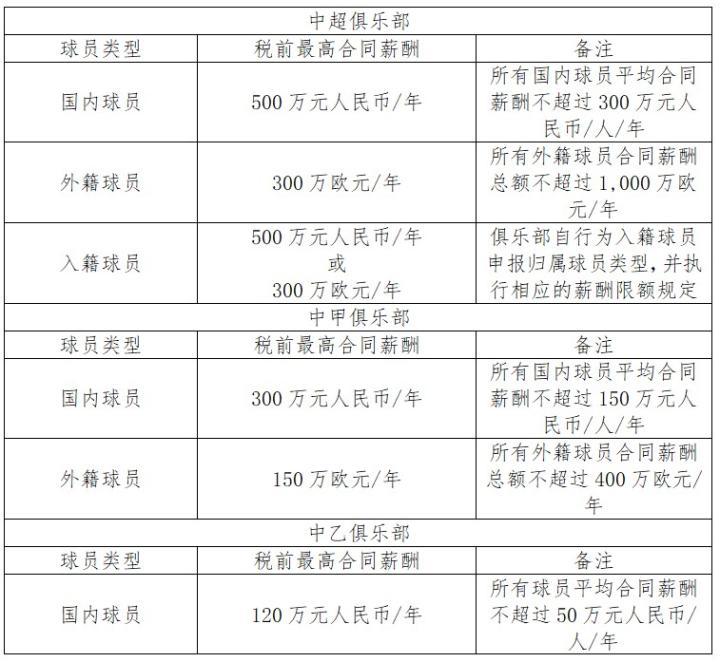优化俱乐部的运营模式,控制中超俱乐部资金投入,适当降低球员薪酬水平。从2021年起,中超俱乐部运营费用年支出不得超过6亿元人民币,中甲俱乐部不得超出2亿元人民币,中乙俱乐部不得超出5,000万元人民币。俱乐部一线队球员合同薪酬限额如下: