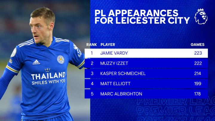 莱斯特城球员在英超出场数: 瓦尔迪以223场超过伊泽特成为第一!