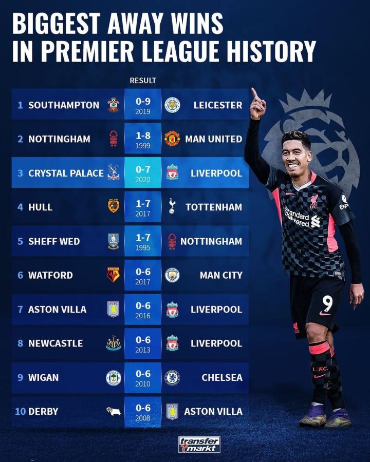上轮英超,利物浦客场7-0狂胜水晶宫,据德转统计,这是英超历史上客场第三大胜利。英超客场最大胜利属于莱斯特城,蓝狐去年在客场9-0屠杀南安普顿。