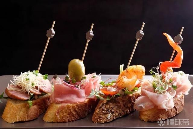 Tapas是西班牙饮食国粹,几乎大餐厅和小馆子都有Tapas。Tapas源起据说是旅客无暇正式用餐,就地在餐厅门口或马车边解决一顿饭,常是一碟菜配块面包,适合忙碌的现代人。