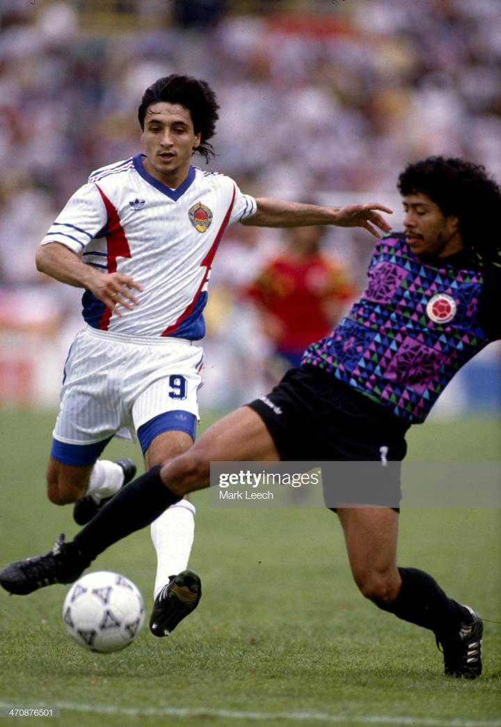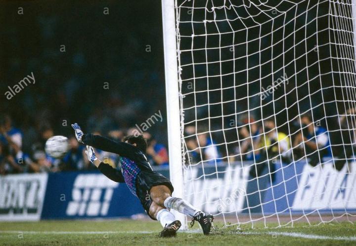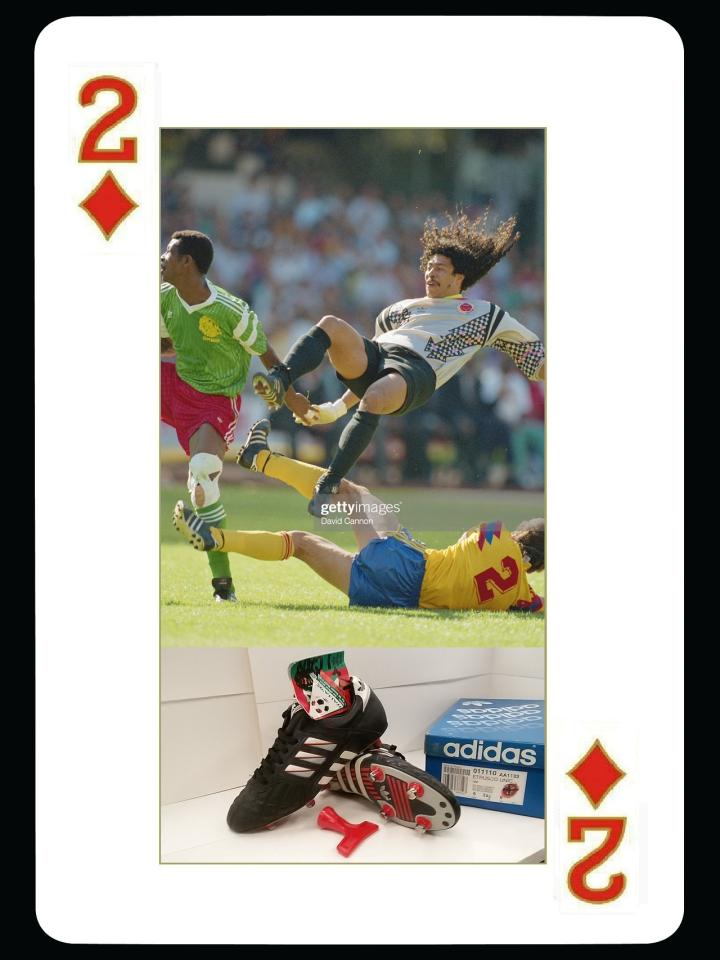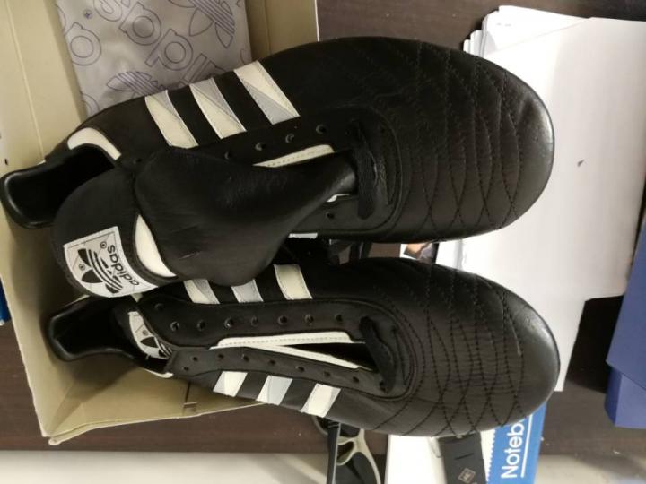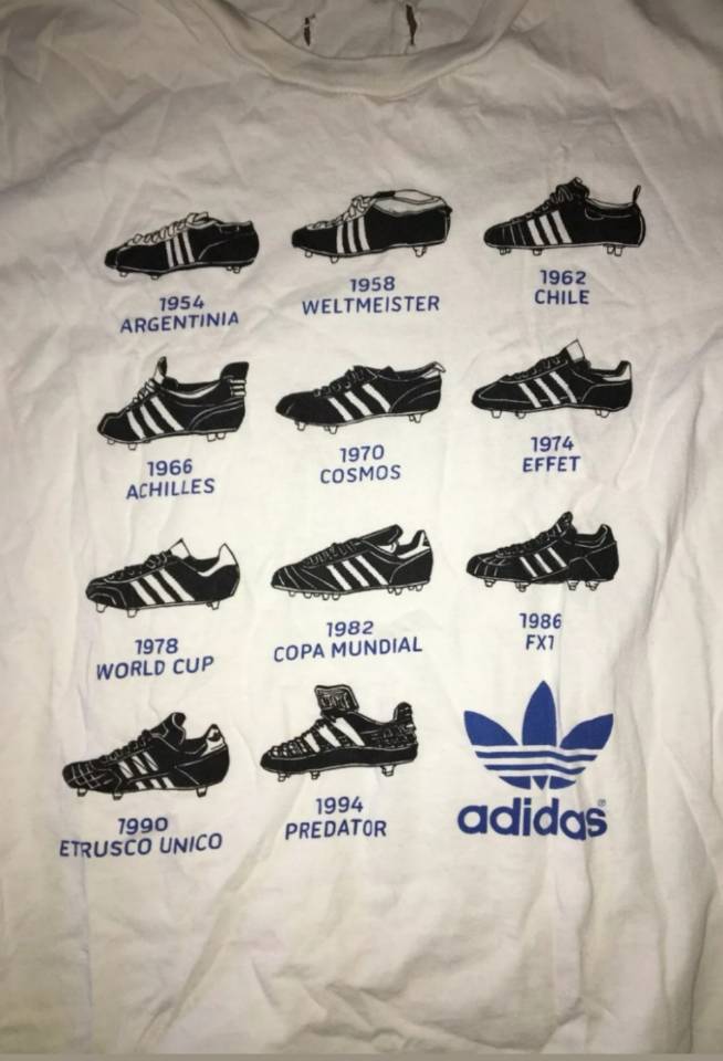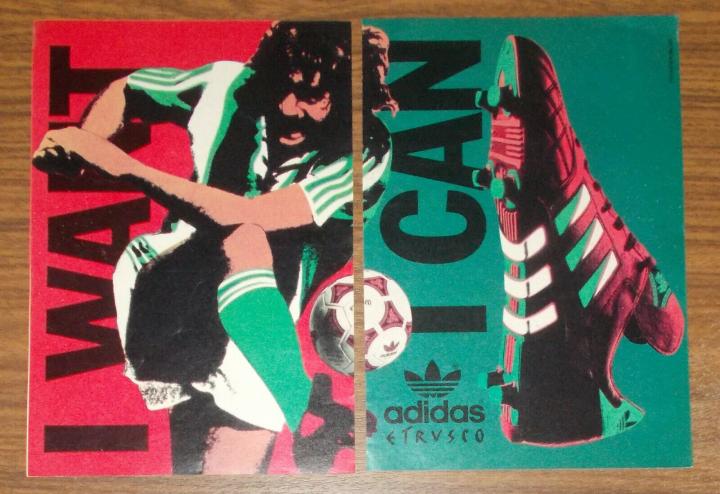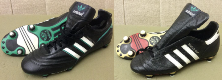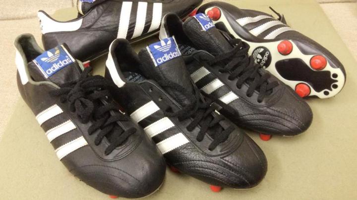 1990年世界杯,adidas的球鞋球鞋叫etrusco,这款鞋上有三头狮标志,和1990年世界杯的比赛用球配套,采用的也是牛皮材质,也属于大刀阔斧力量型球鞋,后卫门将使用比较多,1990年大出风头的哥伦比亚门将伊基塔就穿的这个鞋,不过他的出风头算是砸锅了,被米拉大叔断球绝杀。成为了足球历史上的经典桥段。此外1990年世界杯上另一位最火的门将扑点球专家戈耶切亚也穿的这款球鞋。以上介绍的就是1990年之前大赛上出现的各种款式adidas的古董球鞋。后面的故事我们下次继续分析。