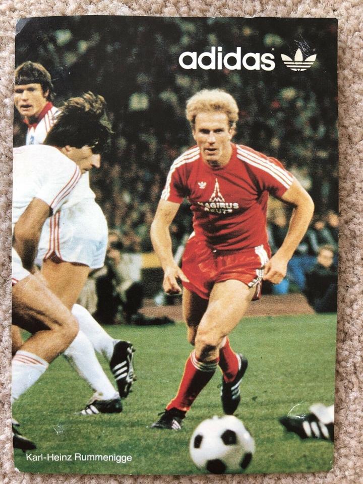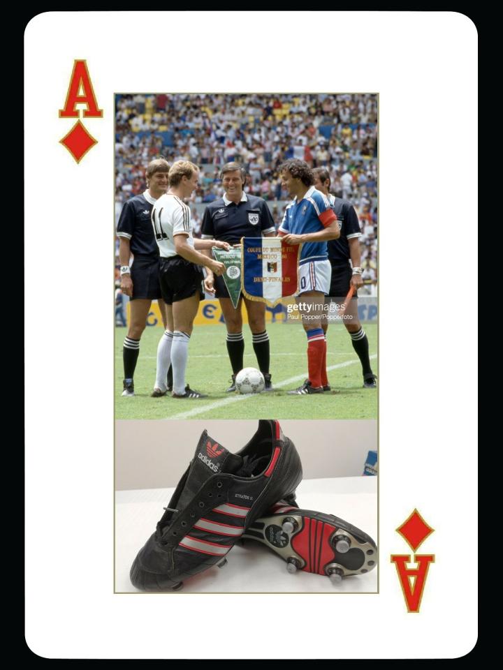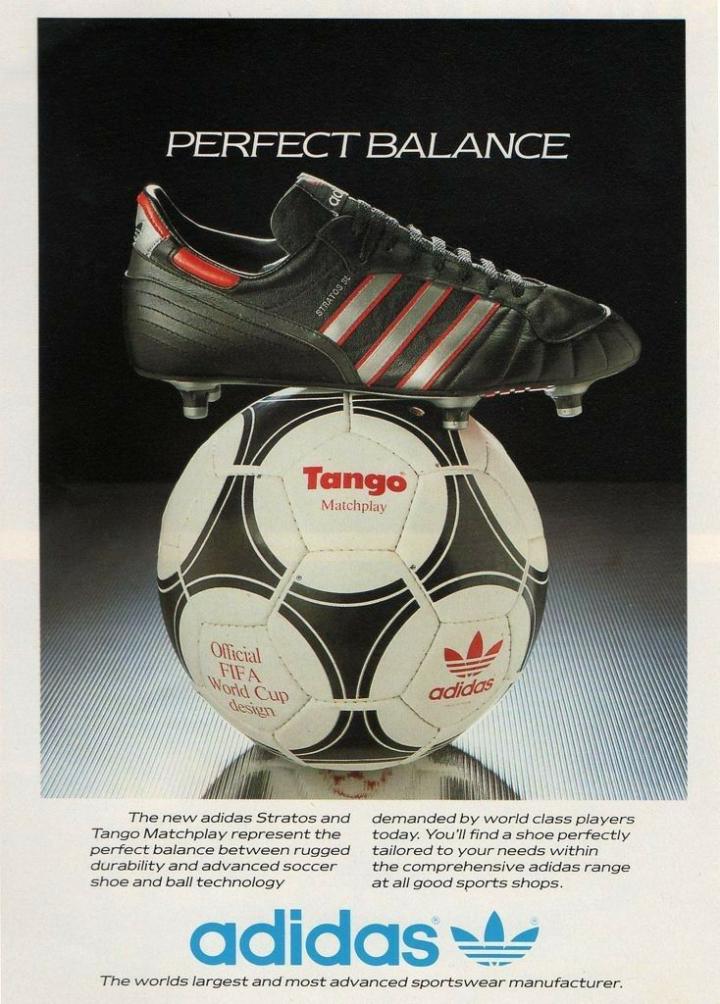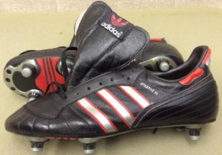 1986年世界杯赛场上,有比较常见的adidas球鞋叫stratos sl,这款鞋推出的时间应该早一些,应该是1986年世界杯之前发布的,甚至有蓝色鞋标的版本,也是adidas最早有轻量化概念的球鞋,采用了袋鼠皮,鞋舌也变的非常轻巧。早年德国和法国是adidas赞助的两大强队,而且两国都是adidas球鞋的产地,1986年世界杯,西德队长鲁梅尼格和法国队长普拉蒂尼穿的都是这款鞋,不过当时普拉蒂尼应该是patrick赞助,在国家队必须穿adidas球鞋。鲁梅尼格则是真正的adidas代言人巨星,有自己的专属款球鞋,不过stratos sl在四年后还是大受追捧,成为了众多巨星使用的战靴。
