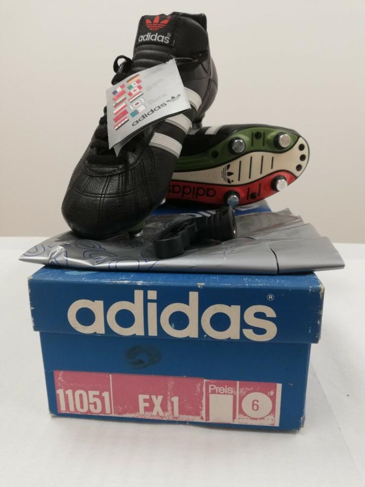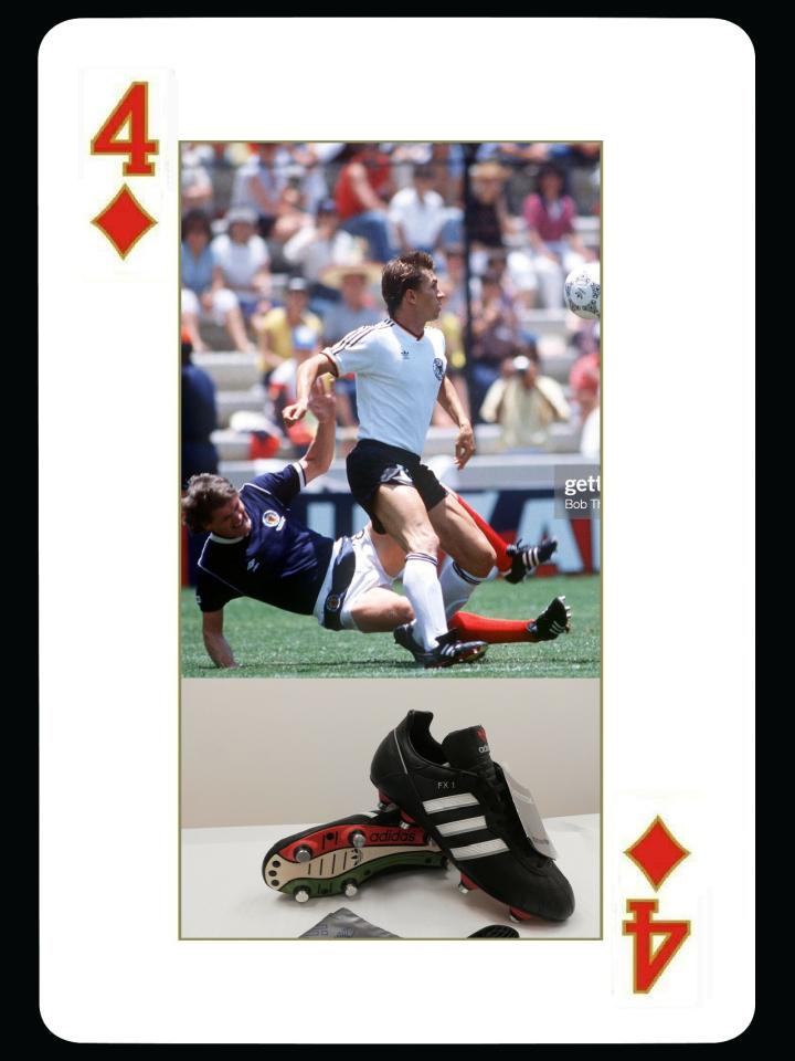 接下来到1986年世界杯,当年adidas正处于巅峰时期,除了我们熟悉的copa和world cup,居然还发布了两款新款球鞋,第一款是世界杯主打款fx-1,鞋子的吊牌上有86年世界杯adidas赞助的12支球队的国旗。这款鞋当年采用了全新的fx鞋底系统。采用的是牛皮鞋面,一些后卫球员比较喜欢使用,当年西德队后卫拜仁队长奥根塔勒在86年世界杯就使用的这款鞋。奥根塔勒职业生涯只效力过拜仁俱乐部,也是西德1990年世界杯冠军队成员。这两支球队当时是adidas包办赞助,所以奥根塔勒一辈子穿的都是adidas球鞋。