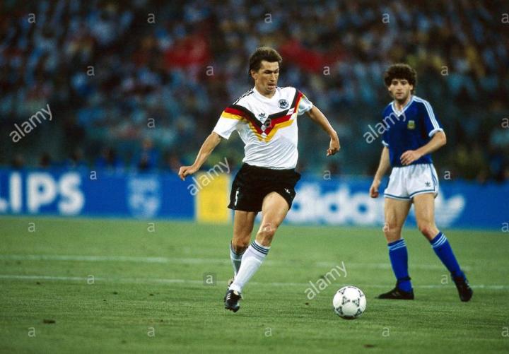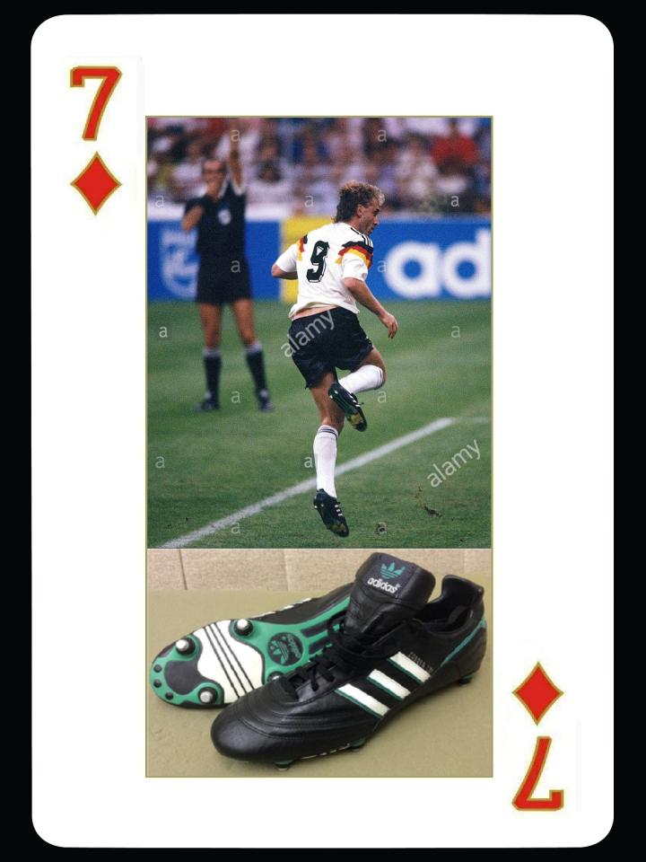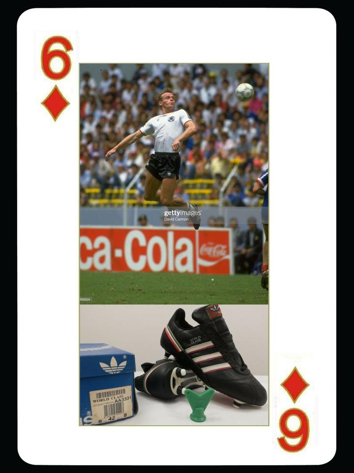 1986年世界杯的第二款adidas战靴是world class,这款鞋的设计最大的亮点是后跟有一条墨西哥国旗绿白红的橡胶条,作为后跟保护,鞋面采用的也是牛皮,不过柔化程度更高一些,使用world class的球员相对比较少,最有名的又是西德队的成员,那就是全能战士布里格尔,他是西德足坛的全才,和马特乌斯一样能踢除了门将以外的所以位置,而且身体素质出色,冲刺跳远可以达到7.5米,可以当十项全能运动员。他在84-85赛季刚刚加盟意甲维罗纳,个人打入9球,帮助实力平平的维罗纳获得意甲冠军,成为当时国际足坛的传奇人物,后来还效力过桑普多利亚队。