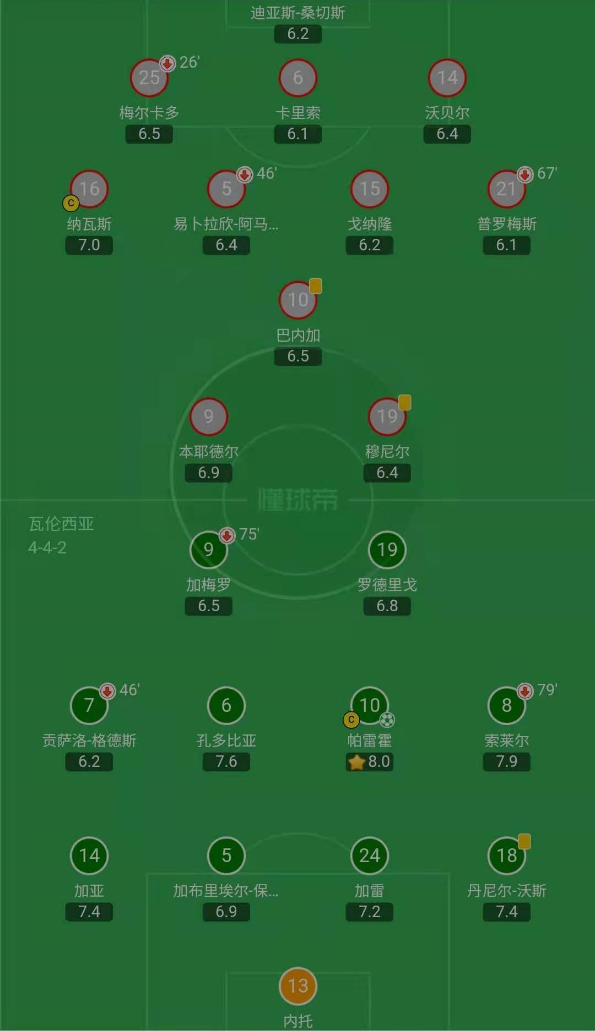 (萨拉维亚缺阵,这个阵容中铁定在瓦伦打上主力的只有纳瓦斯和本耶德尔,巴内加可以和前队友帕雷霍轮换)