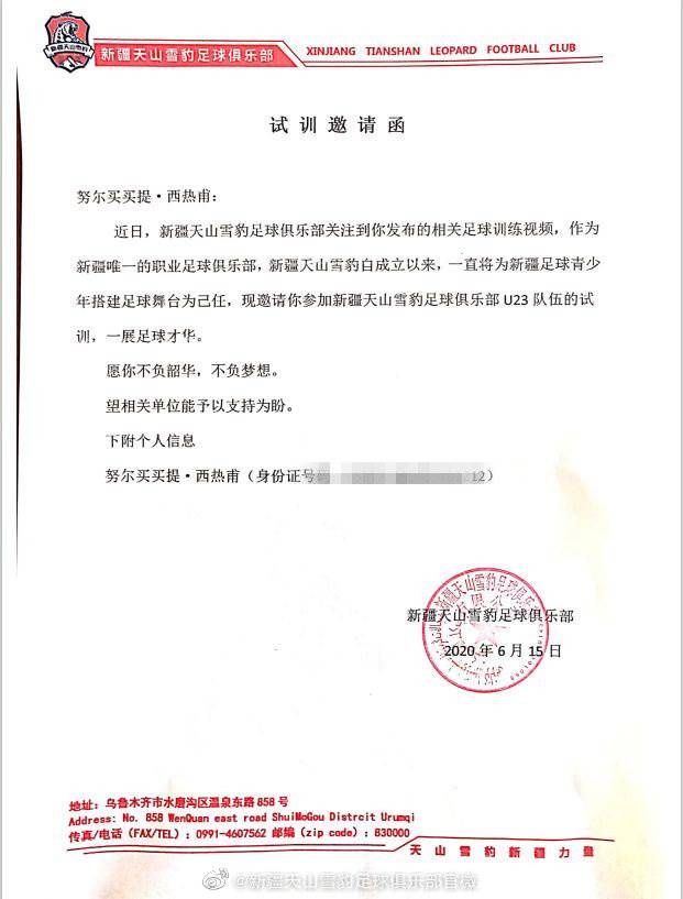 今年2月,新疆雪豹纳欢就关注到了努尔买买提,当时就有工作人员跟他取得了联系,但因雪豹在云南海埂封闭式训练,所以就没有邀请试训。6月15日,新疆天山雪豹足球俱乐部向抖音网红“努尔飞腿”发出了试训邀请,并表示相关部门予以支持。