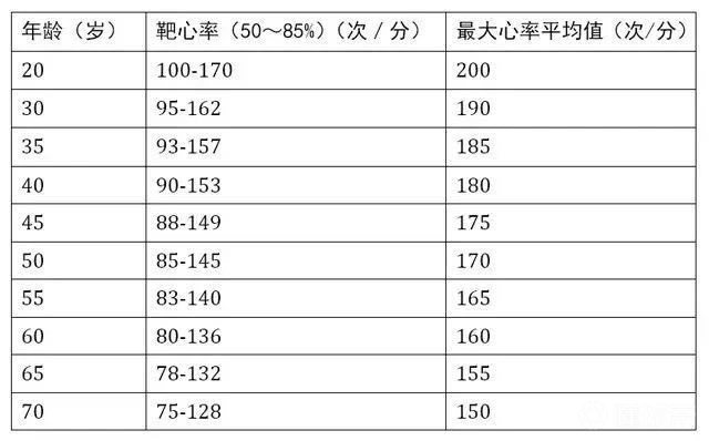 到底使心率增加多少的运动强度才是最合适的呢? (图为心率和年龄的对应基本参考关系) 最简单的办法是通过靶心率(THR:Target Heart Rate)来判断。 *靶心率是指通过有氧运动提高心血管机能(心肺机能)时,有效而安全的运动心率。 [吃瓜][吃瓜][吃瓜] 对于健康成年人来说,通常静息心率为60~100次/分钟。粗略估算最大心率最简单的办法为220减去年龄,美国心脏病协会(AHA)推荐运动强度为:使心率增加至最大心率的50%~85%,这个范围称为靶心率。 (心跳越慢也是身体越健康的一个民间指标,非官方。所以如果你心跳50多次,完全不用担心) 靶心率测算; 例如:如果你30岁,那么你的最大心率就是190次/分。靶心率为95-157次/分。 医生对于中老年朋友一般将靶心率最高值控制在110-130次/分范围内为最佳。 [吃瓜][吃瓜][吃瓜] 运动时突发心血管疾病的案例时有所闻,因此安全运动日益受到重视。控制运动靶心率是一种安全的运动强度设定方法,也是医学上心血管病患者康复治疗方法。 请先确定自己的心血管状态,以保证运动时不超过心血管系统的承受能力。同时,注意保证充分的准备和结束活动,防止发生运动损伤和心血管意外。 [绿帽狗头][绿帽狗头][绿帽狗头] 温馨提示: 建议心血管疾病患者在运动计划前,请先咨询医生建议。心脏骤停是个很危险的事情就,在运动过程中进行医疗级别的心电监测,逐步增加活动,循序渐进,安全运动,科学康复。