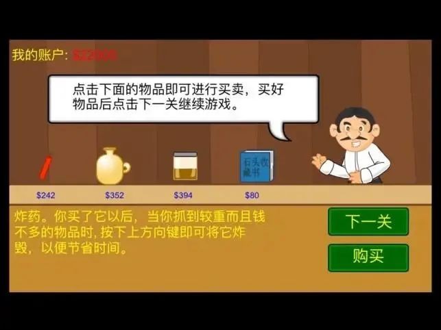 当收到金灿灿的恭喜通关,立马会有留着八字胡的精明男人出来推销,所有的商品都指向一个目的,那就是让你更好的挖矿。
