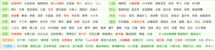 和hao123网站集合页的逻辑如出一辙,2002年出生的4399就是一个大型的网络小游戏超市。