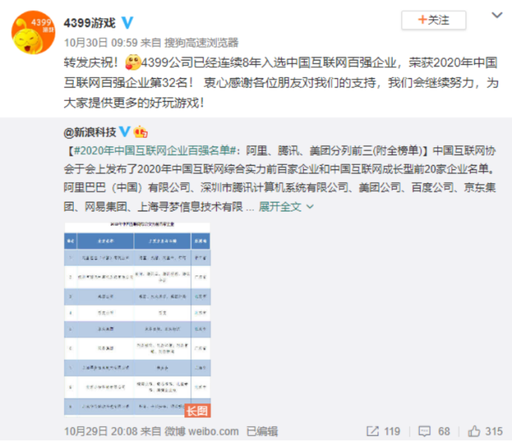 10月30日,中国互联网协会发布互联网百强企业名单,4399排名第32位。