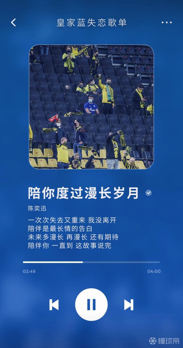 皇家蓝失恋歌单——用音乐回顾这不平凡的一年。20...沙尔克04足球俱乐部 @懂球帝2020-12-26 13:00皇家蓝失恋歌单——用音乐回顾这不平凡的一年。2020年,你在沙尔克失恋歌单中听到最多一句歌词是,“一次次失去又重来,我没离开”。感谢你的不离不弃,陪伴是最长情的告白。展开更多
