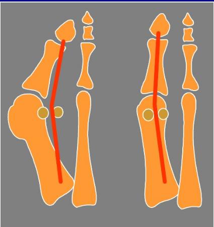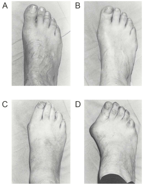 ④ 其他原因:如第一跖趾关节类风湿关节炎、痛风等,第一跖趾关节及其附近跖骨、趾骨的畸形愈合,第二趾切除后,神经肌肉性病变致肌力不平衡等。