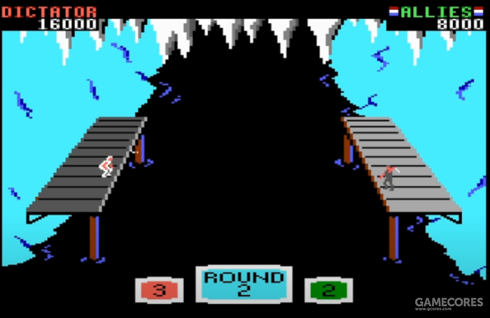 随后,Access Software又在85年推出了系列续作《抢滩登陆2:独裁者的反攻》。游戏的前两关还是熟悉的固定炮台射击,第三关却成了飞行射击,第四关则是...呃,和反派互丢飞镖?