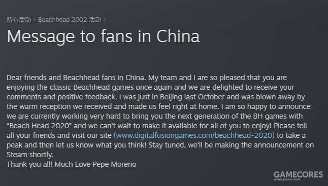 17年,电子融合将《抢滩登陆2000》、《抢滩登陆2002》以及《抢滩登陆沙漠战》三款作品上架了Steam,捆绑包只要30元。佩佩莫雷诺还在Steam社区特别写了一封感谢信寄予中国粉丝。