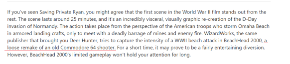 不过在油管上一个讲述《抢滩登陆》的视频下方,有一位自称是《抢滩登陆》系列程序员的用户却特别指出,《抢滩登陆2000》和《抢滩登陆2002》其实和C64上的《Beach head》并无继承关系,他本人也不曾玩过那款游戏。只能说二者在题材和玩法上有重合,但是并非同一IP。