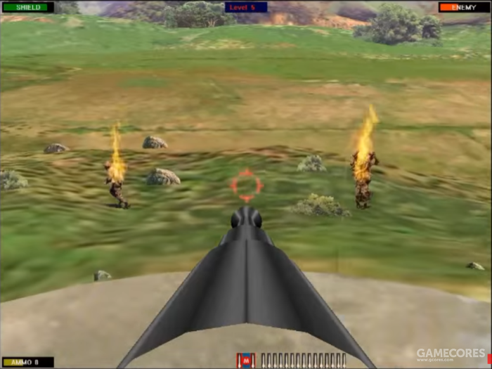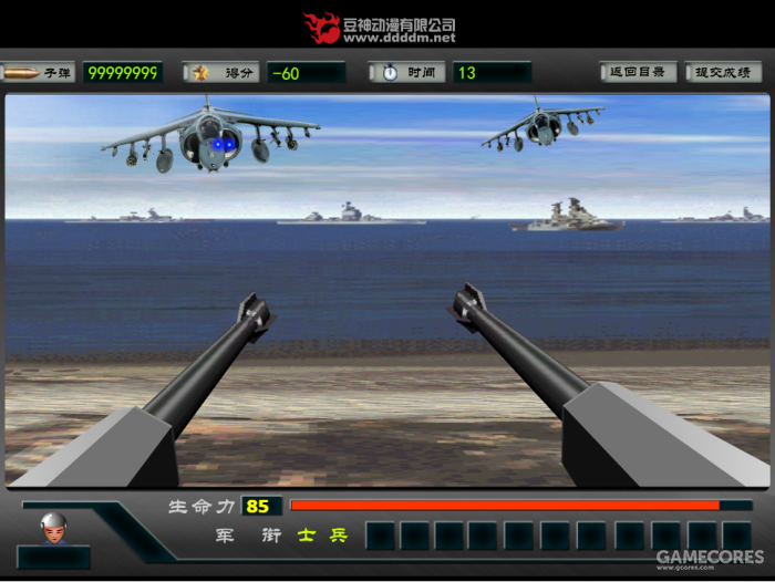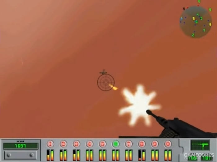 随后会进入防空战阶段。玩家以第一人称视角控制一个双管机枪,迎击从正面向你袭来的飞机,这一部分和后来的《2000》就有几分相似了。