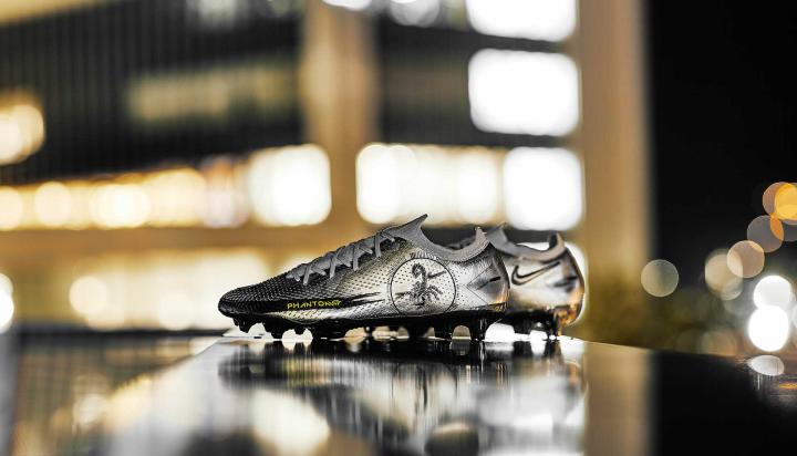 Nike Phantom GT的银色包装是为了向史上最伟大的足球广告 "蝎斗铁笼"致敬。占据中心位置的是蝎子图案,银色让人想起那个标志性的球。