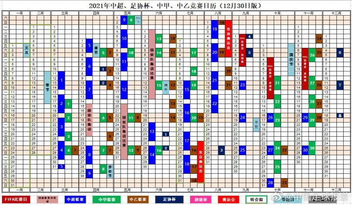 2021年中国足球赛历(12月30日初定版)出炉,中超将会在3月11日开始,世预赛9、10、11月进行。不过人民日报体育表示,2021赛季中国足球职业联赛赛程赛制尚未最终确定。