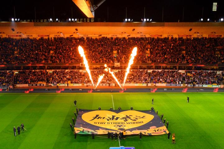 2月14日,19/20赛季英超第26轮,狼队主场与莱斯特城的比赛现场,我们打出了“加油武汉”的巨型TIFO,为正在抗击新型冠状病毒肺炎的武汉加油鼓劲!而在英国疫情加重后,狼队联合复星集团多次向英国捐赠医疗防护物资。“万里比邻,民胞物与。”