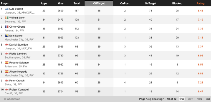 (图)索尔达多58.6%的射门脱靶率是全英超出场超过20次的中锋最高的