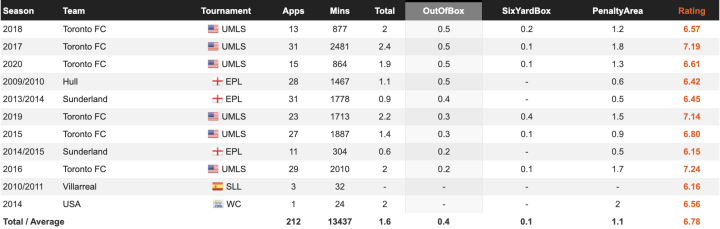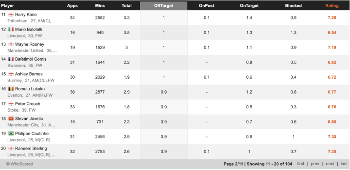 (图)约维蒂奇场均0.9次的射门脱靶可以排在104名出场15次以上的前场球员中的第18名