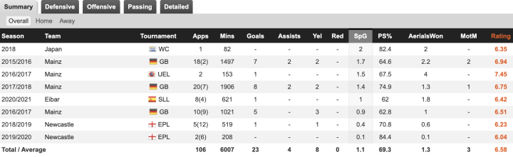 (图)武藤嘉纪在纽卡的两年是职业生涯的最低谷,各项进攻数据都创下了生涯新低