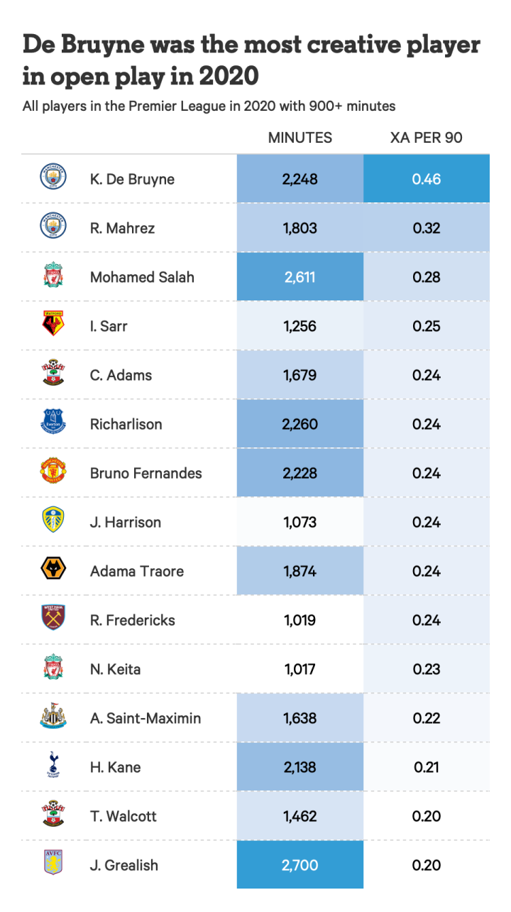 凯文-德布劳内是2020年运动战中最有创造力的球员,他在运动战中预期每90次助攻次数(通过统计他助攻的xG值来计算)在联盟中无人能及。