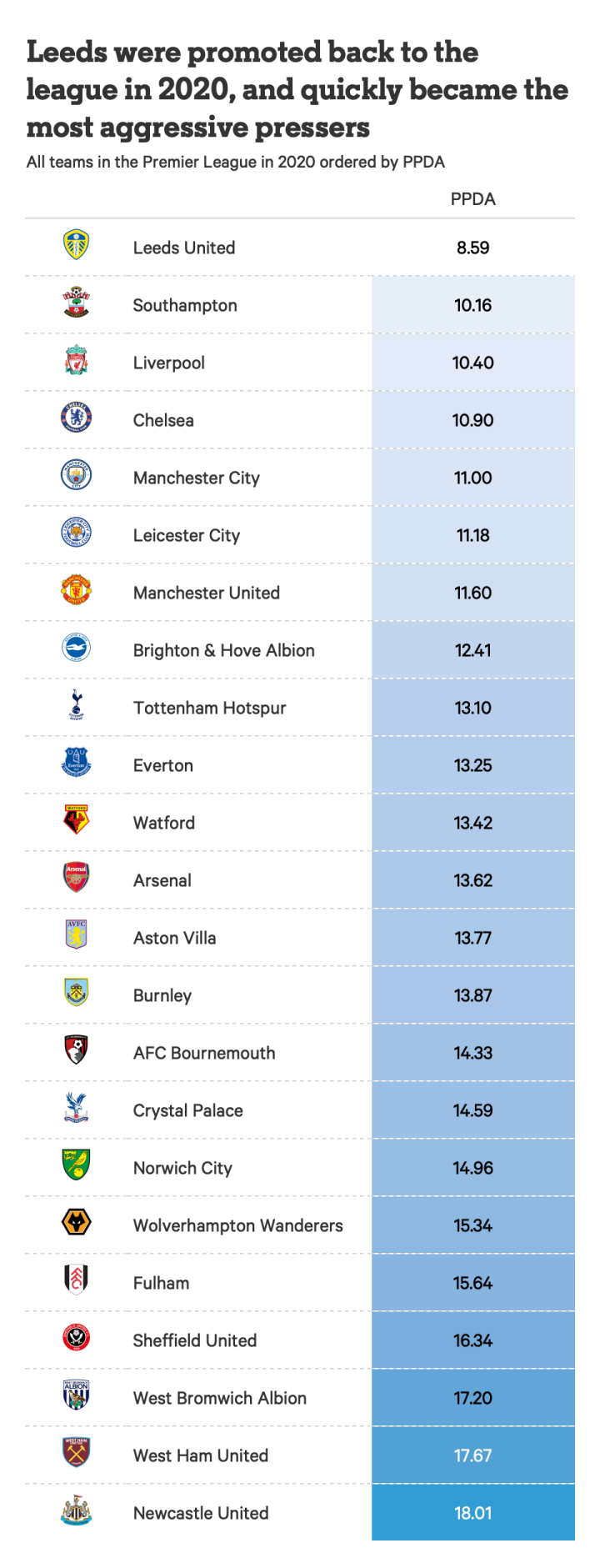 利兹队的PPDA(平均每次完成防守时进攻方连续完成的传球次数)是联赛中最低的,排在南安普顿队和克洛普的利物浦队之前。在榜单的另一端是控球率比较被动的球队,纽卡斯尔是过去五个赛季英超联赛中无球状态下逼抢最松散的球队。
