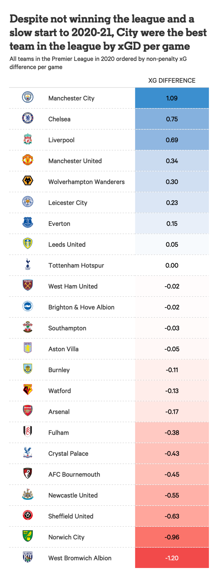 有趣的是,切尔西是这个衡量标准中第二好的球队。糟糕的门将意味着他们的失球比预期的要多,但在整个2020年,攻防两端的数据综合来看还是不错的。