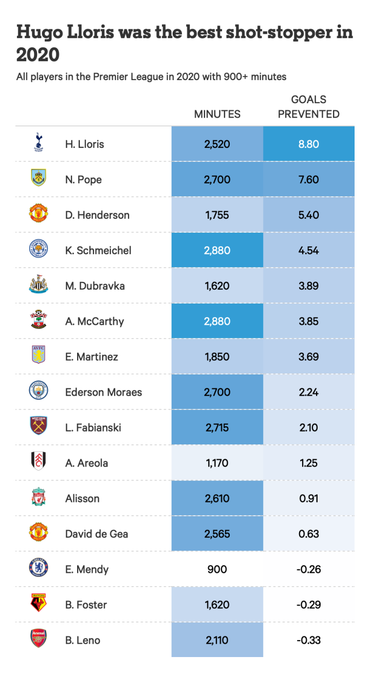 洛里占据了这个榜单的头名,力压第二名的英格兰门将波普,比预期多防住了近9个球。尽管阿利松被许多人认为是英超中最好的守门员,但阿利松在2020年的这个指标上并没有你想象的那么好,扑出来的进球数仅比预期少0.91个。