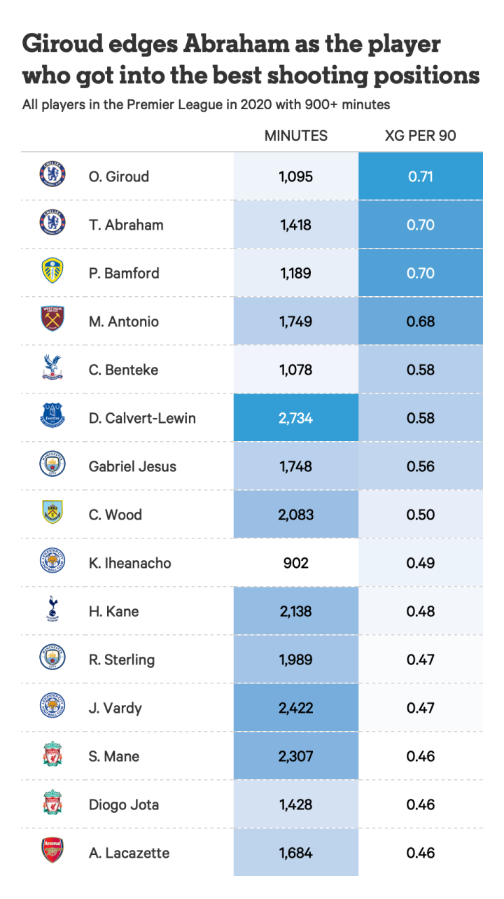 不过2020年的吉鲁成功逆袭。他在联赛中的出场时间虽不如其他前锋,但在吉鲁上场的1095分钟里,只有120分钟是作为替补出场的。他的8个英超进球都是在他首发的比赛中打进的,这说明他在34岁的年纪仍然有能力同最高水平的前锋竞争。