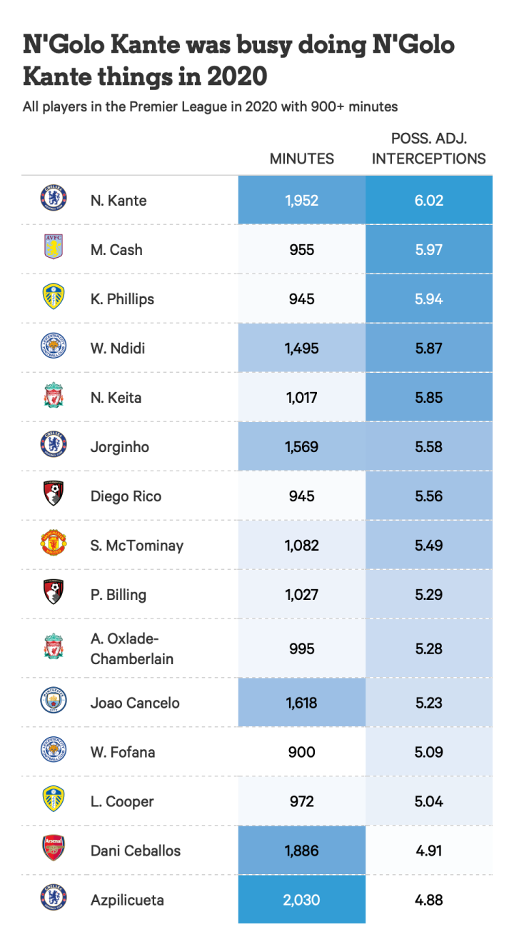 坎特在这方面做的比2020年的任何球员都要好。