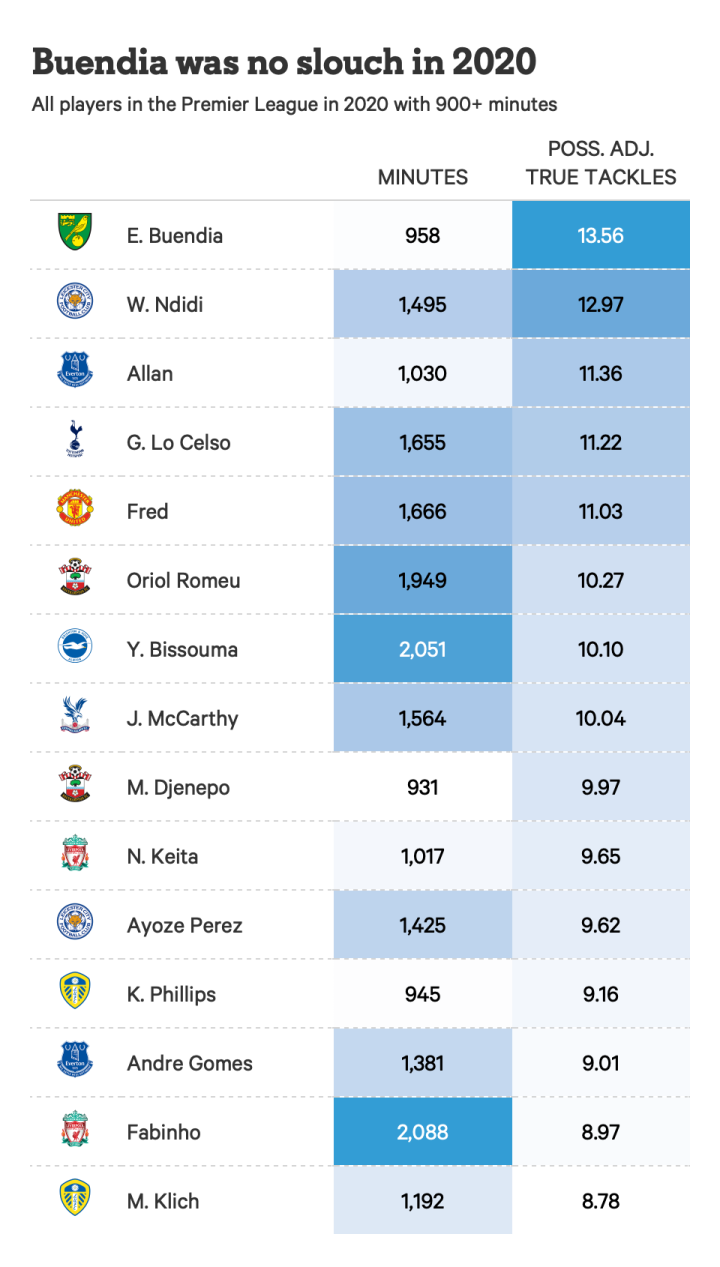 布恩迪亚是一名边锋,却在2020年的最高抢断榜上排名第一。