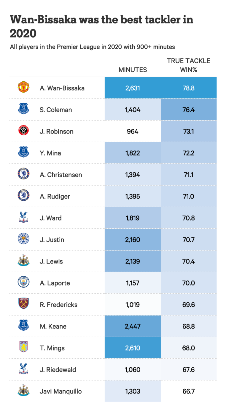 在一份以后卫为主的榜单中,阿伦-万-比萨卡脱颖而出,成为2020年英超最会铲球的球员,这个数据也是通过观看比赛就能得到的直观感受。